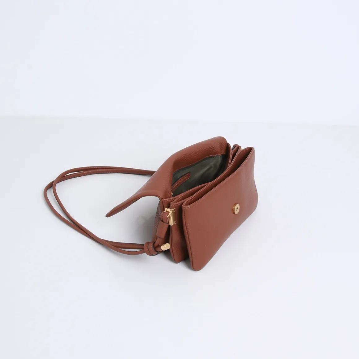 De tas opent zich aan de voorkant en is gesloten met een magneetsluiting. De driedeling van de vakjes definieert de vorm en maakt dat je de BANGLE neer kunt zetten zonder dat deze omvalt. Door de ronde en luchtige afwerking bij de naden voelt de tas soepel en zijdezacht aan.