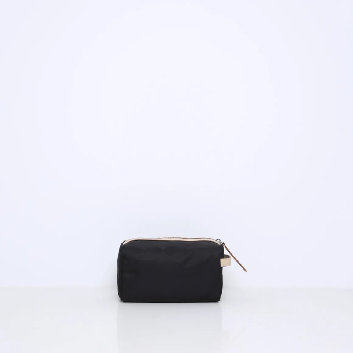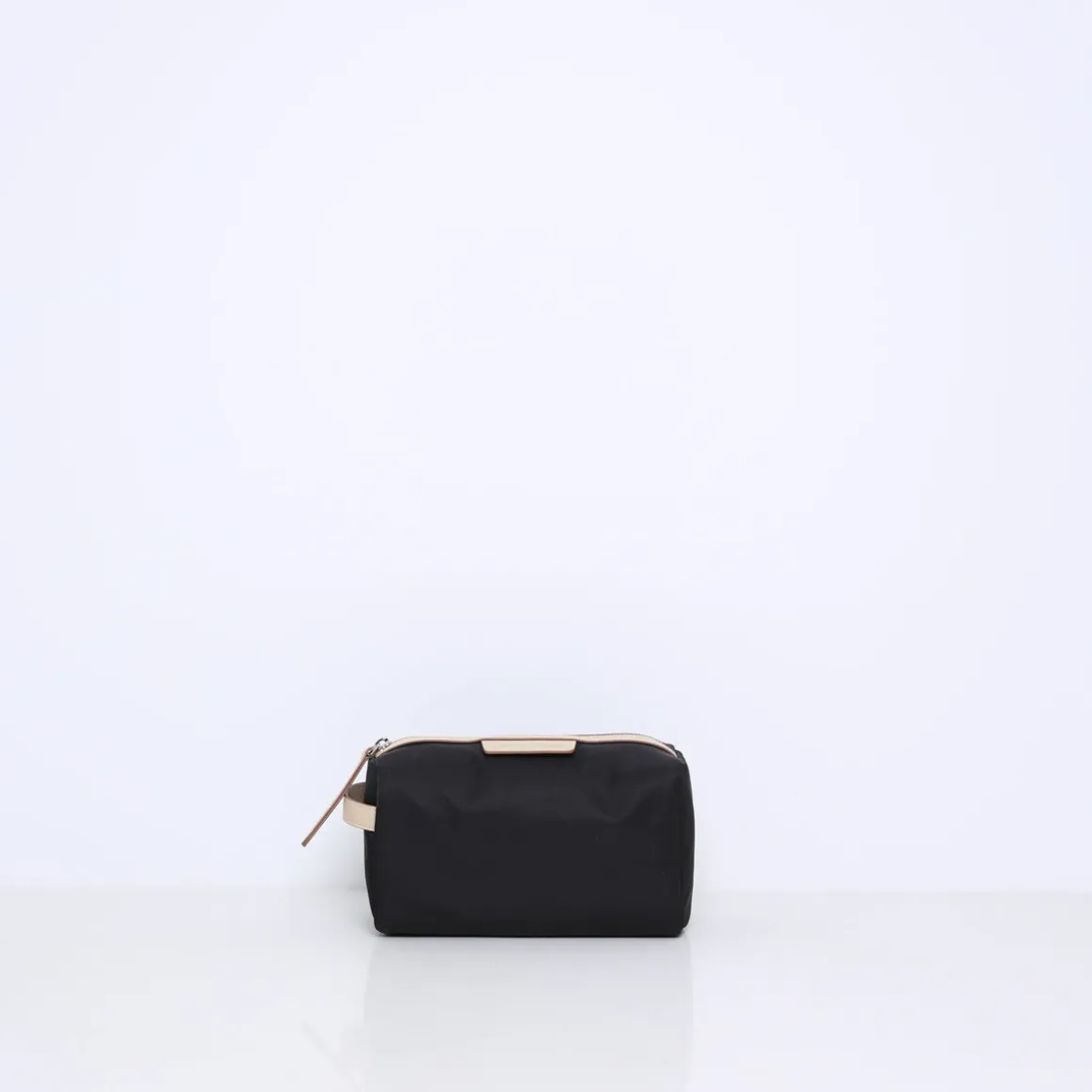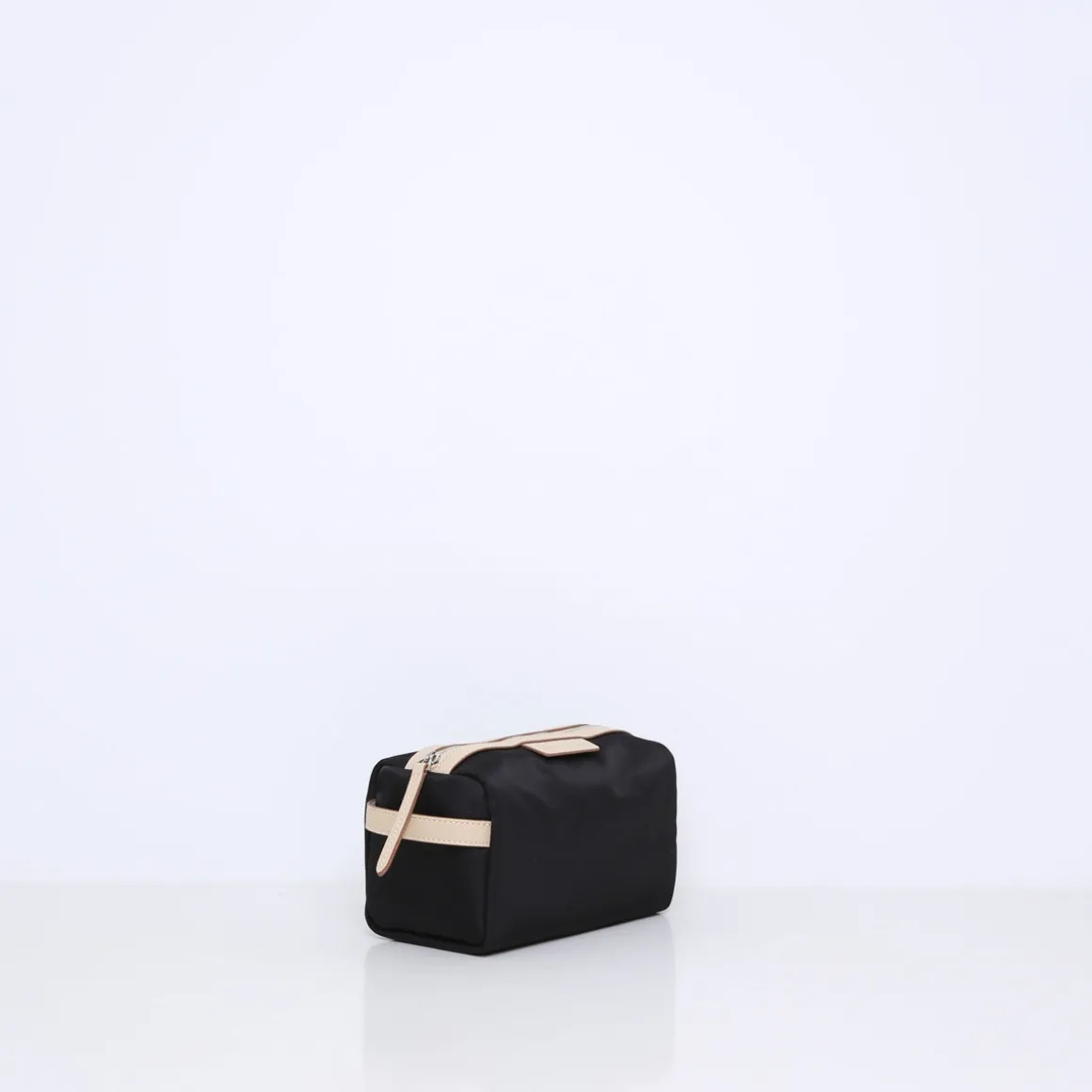 Ontdek onze veelzijdige nylon travel pouch, afgewerkt met luxe leerdetails. Deze stijlvolle pouch is perfect te gebruiken als clutch, extra binnentas, of toilettas. Het ontwerp heeft geen extra binnenvakjes, waardoor het ruim en praktisch blijft. De binnenkant is gevoerd met zacht suedine (viscose) materiaal, wat extra bescherming biedt voor je spullen. De rits aan de bovenkant zorgt voor gemakkelijke toegang en veiligheid. Met zijn elegante rechthoekige/cilindrische vorm en een handige leren greep aan de zijkant, kun je de pouch gemakkelijk vasthouden en meenemen. Deze pouch combineert functionaliteit met een chic design, ideaal voor al je reisbenodigdheden en dagelijkse essentials.