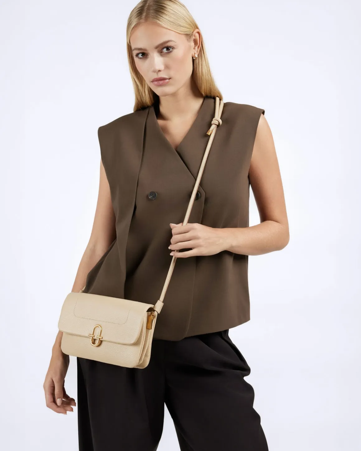 De tas opent zich aan de voorkant en is gesloten met een magneetsluiting. De driedeling van de vakjes definieert de vorm en maakt dat je de BANGLE neer kunt zetten zonder dat deze omvalt. Door de ronde en luchtige afwerking bij de naden voelt de tas soepel en zijdezacht aan.