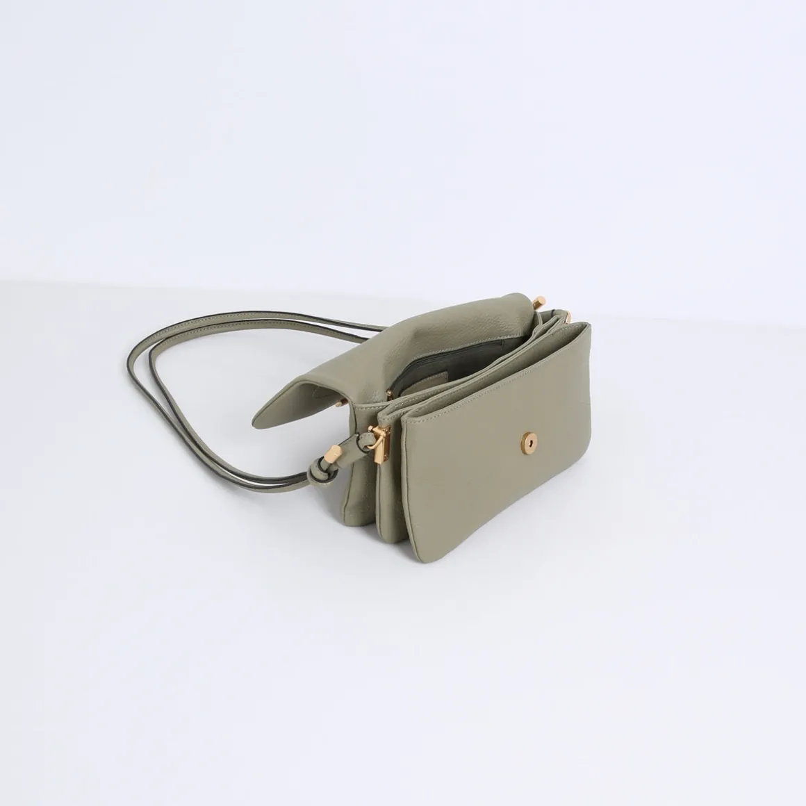 De tas opent zich aan de voorkant en is gesloten met een magneetsluiting. De driedeling van de vakjes definieert de vorm en maakt dat je de BANGLE neer kunt zetten zonder dat deze omvalt. Door de ronde en luchtige afwerking bij de naden voelt de tas soepel en zijdezacht aan.