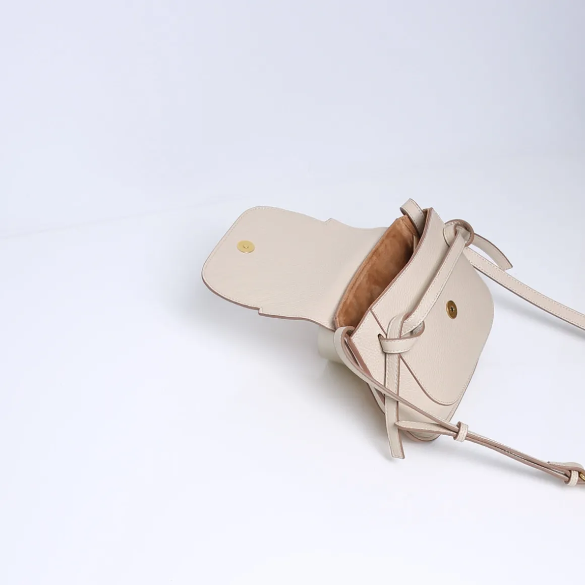 De tas is gemaakt van zacht en soepel rundleer. Beschikt over meerdere binnenvakjes en is gevoerd met stof (viscose). De leren schouderband is verstelbaar in lengte en zit vast aan de tas.