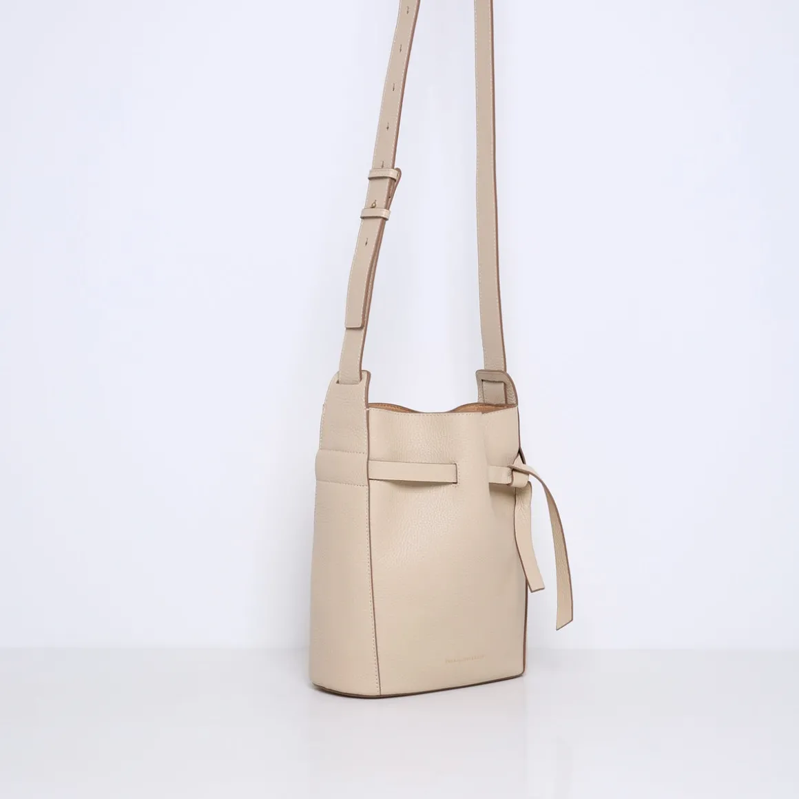 De JACKIE is een middelgrote crossbody tas, ontworpen met een stijlvolle hoge bucketvorm waarvan de strap verstelbaar is in lengte. De vorm van de tas kan eenvoudig worden aangepast met behulp van de leren verbinding en de decoratieve lus aan de bovenkant. De tas heeft een open bovenkant voor gemakkelijke toegang en biedt een ruim interieur met één groot vak, ideaal voor het organiseren van je dagelijkse benodigdheden. Deze tas combineert functionaliteit met een elegant design, perfect voor zowel dagelijks gebruik als speciale gelegenheden.